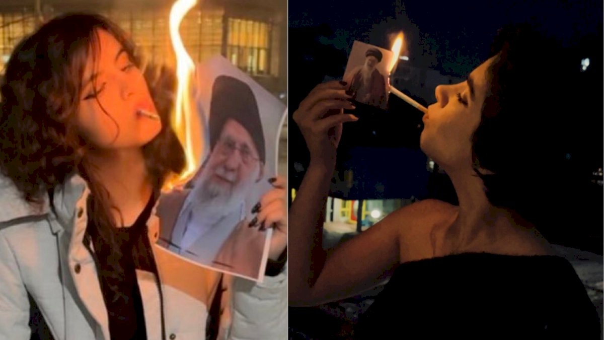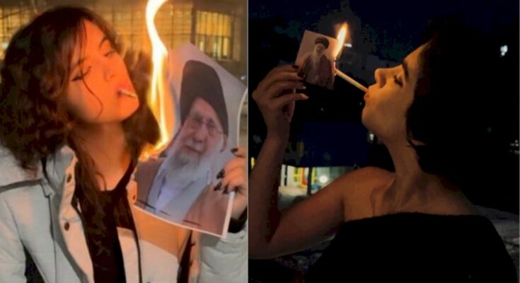 ईरानी महिलाएं सुप्रीम लीडर आयतुल्ला अली खामेनेई की तस्वीरों से सिगरेट जला रही हैं, जो पूरे विश्व में वायरल हो रहा है।