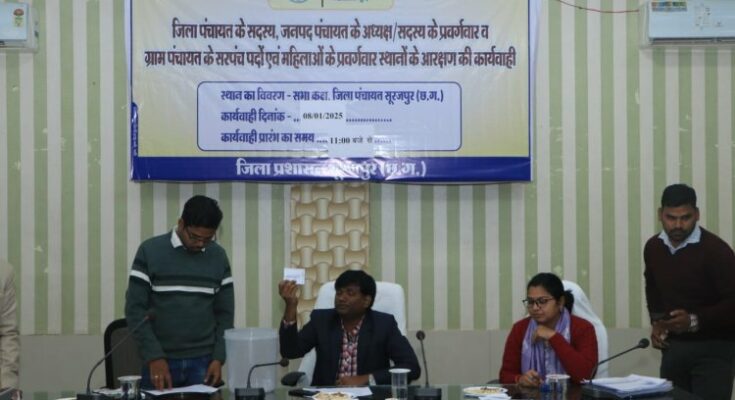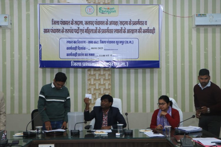 कल कलेक्टर एस.जयवर्धन की उपस्थिति में जिला पंचायत के सभा कक्ष में जिला पंचायत के सदस्य, जनपद पंचायत के अध्यक्ष /सदस्य के प्रवर्गवार स्थानों के आरक्षण की कार्यवाही सम्पन्न हुई। इस अवसर पर जनप्रतिनिधि, जिला पंचायत सीईओ कमलेश नंदिनी साहू, उप निर्वाचन अधिकारी नरेंद्र पैकरा, डी डी पंचायत ऋषभ सिंह चंदेल व अन्य संबंधित अधिकारी उपस्थित थे। जिला पंचायत के 15 सीटो में से आठ सीट महिलाओं के लिए आरक्षित की गई है। सूरजपुर-1-सामान्य महिला, सूरजपुर-2-एससी महिला,सूरजपुर-3-सामान्य, सूरजपुर-4-एसटी महिला, ओड़गी-1-एसटी महिला, ओड़गी-2-एसटी भैयाथान-1-सामान्य भैयाथान-2-सामान्य, प्रेमनगर-एसटी महिला, प्रतापपुर-1-एसटी , प्रतापपुर-2-एसटी प्रतापपुर-3-एसटी महिला, रामानुजनगर-1-सामान्य महिला, रामानुजनगर-2-सामान्य महिला रामानुजनगर-3-एसटी वर्ग के लिए आरक्षित किया गया है। इसी तरह जिले के जनपदों में तीन ब्लाकों का अध्यक्ष पद महिलाओं के लिए आरक्षित किया गया है जिसमे ओड़गी,प्रतापपुर व सूरजपुर के अध्यक्ष पद पर महिला व रामानुजनगर, प्रेमनगर व भैयाथान में पुरुष आसीन होंगे।