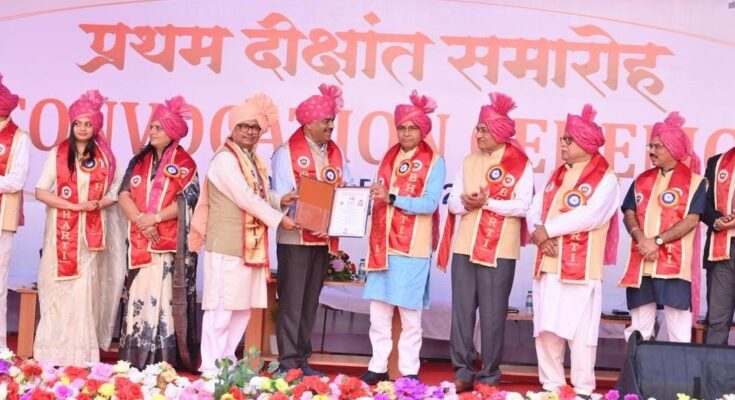 समारोह को संबोधित करते हुए उच्च शिक्षा मंत्री श्री वर्मा ने सभी उपाधि प्राप्त शोधार्थियों एवं विद्यार्थियों को बधाई और शुभकामनाएं दीं। उन्होंने कहा कि दीक्षांत केवल डिग्री प्राप्ति का अवसर नहीं, बल्कि जीवन की नई जिम्मेदारियों की शुरुआत है। अर्जित ज्ञान का उपयोग समाज के विकास और राष्ट्र निर्माण में होना चाहिए। उन्होंने कहा कि 21वीं सदी नवाचार की सदी है और शिक्षा को जीवन निर्माण का सशक्त माध्यम बनाना होगा। विश्वविद्यालय द्वारा ज्ञान, संस्कार और नवाचार का जो प्रसार किया जा रहा है, वह प्रदेश और देश के लिए गौरव की बात है। उन्होंने प्राध्यापकों से आह्वान किया कि वे विद्यार्थियों में नैतिक मूल्यों के साथ-साथ राष्ट्र निर्माण की भावना का संचार करें। प्रधानमंत्री नरेंद्र मोदी के विजन–2047 का उल्लेख करते हुए उन्होंने कहा कि विकसित भारत के लक्ष्य को प्राप्त करने में युवाओं की भूमिका अत्यंत महत्वपूर्ण है।