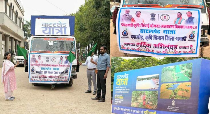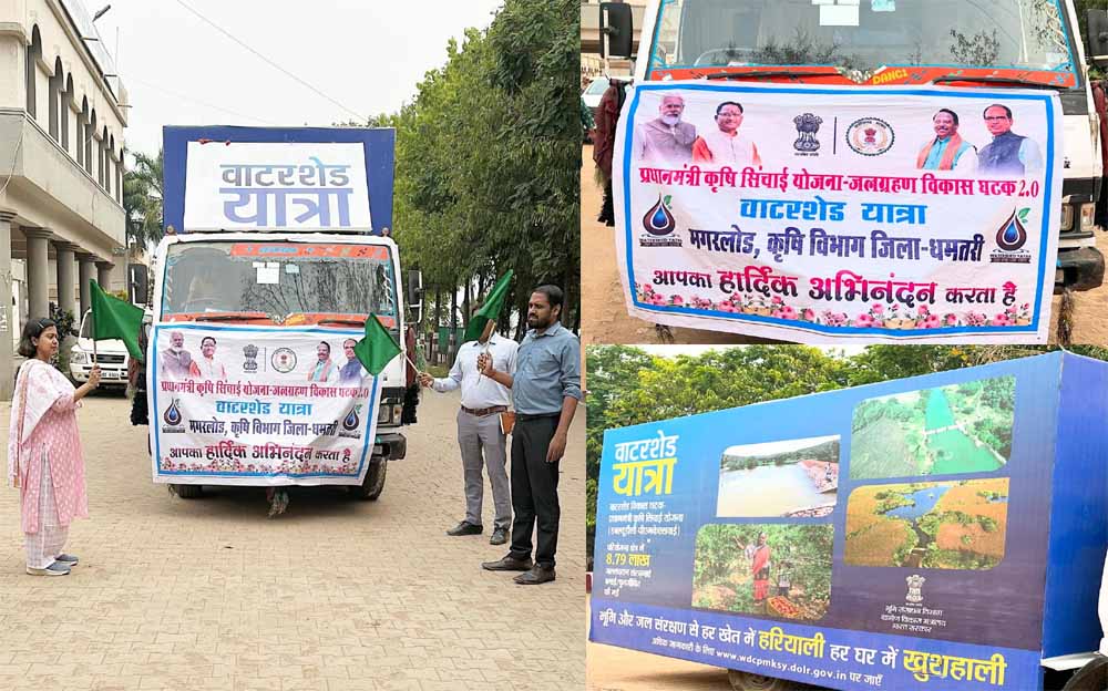 कलेक्टर अबिनाश मिश्रा ने कलेक्टोरेट परिसर से वाटरशेड रथ को हरी झण्डी दिखाकर रवाना किया। यह रथ जिले के मगरलोड विकासखण्ड के विभिन्न गांवों में पहुंचकर जल संरक्षण और भूमि संरक्षण के बारे में लोगों को जागरूक करेगा। ग्रामीणों को इस रथ के माध्यम से पानी बचाने, पानी का समुचित उपयोग करने, जमीन के उर्वरा शक्ति को बचाने-बढ़ाने के लिए किए जाने वाले उपायो की जानकारी ऑडियो वीजुअल माध्यम से दी जाएगी। धमतरी जिले में यह रथ जलग्रहण मिशन कार्यक्रम के तहत प्रधानमंत्री कृषि सिंचाई योजना के माध्यम से भूमि संसाधन विभाग ग्रामीण विकास मंत्रालय नई दिल्ली द्वारा भेजा गया है। यह रथ दो अप्रैल को धमतरी पहुंचा है।