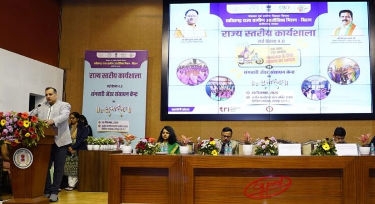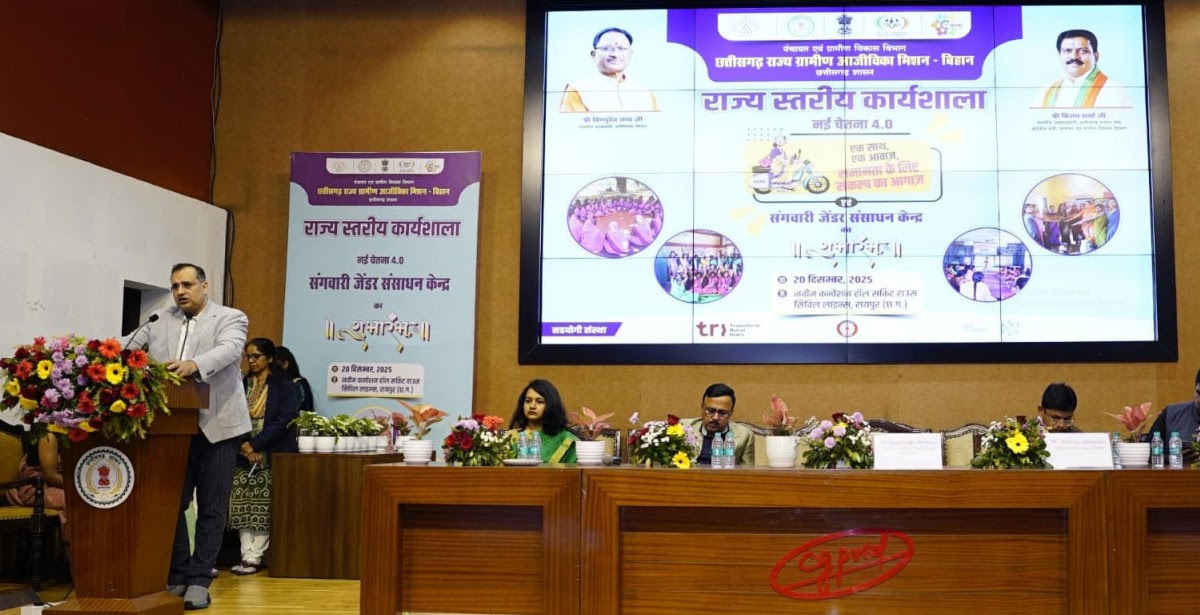 रायपुर, 21 दिसंबर 2025 छत्तीसगढ़ राज्य ग्रामीण आजीविका मिशन  द्वारा राष्ट्रीय अभियान ‘नई चेतना 4.0’ के अंतर्गत एक दिवसीय राज्य स्तरीय जेंडर कार्यशाला का आयोजन आज नए सर्किट हाउस रायपुर में किया गया। कार्यशाला में प्रमुख रूप से पंचायत एवं ग्रामीण विकास विभाग के सचिव भीम सिंह तथा छत्तीसगढ़ राज्य ग्रामीण आजीविका मिशन के मिशन संचालक अश्विनी देवांगन सहित विभिन्न विभागों के वरिष्ठ अधिकारी उपस्थित रहे।