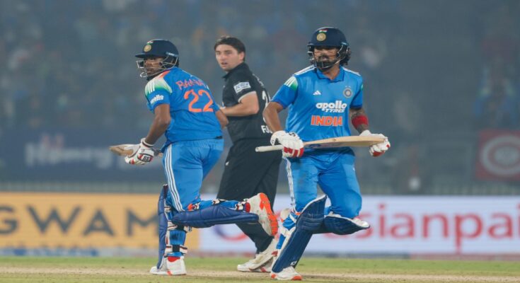 रविवार को भारत ने टॉस जीतकर पहले गेंदबाजी का फैसला किया था। न्यूजीलैंड की टीम ने निर्धारित 50 ओवर में 8 विकेट पर 300 रन बनाए थे। मेहमान टीम की ओर से डेरिल मिचेल ने 71 गेंदों पर 84 रन की सबसे बड़ी पारी खेली। वहीं, हेनरी निकोल्स ने 62 और डेवोन कॉन्वे ने 56 रन जोड़ते हुए टीम को मजबूत स्कोर तक पहुंचाया। भारतीय गेंदबाजों में मोहम्मद सिराज, प्रसिद्ध कृष्णा और हर्षित राणा ने दो-दो विकेट झटके, जबकि कुलदीप यादव को एक सफलता मिली।