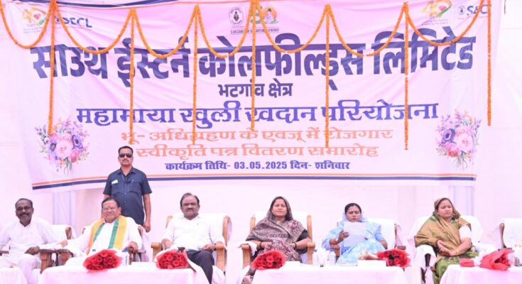 सूरजपुर । महिला एवं बाल विकास मंत्री लक्ष्मी राजवाड़े ने सूरजपुर जिले के जरही कपसरा मैदान में आयोजित कार्यक्रम में साउथ ईस्टर्न कोलफील्ड्स लिमिटेड (एसईसीएल) भटगांव क्षेत्र के अंतर्गत भू-अधिग्रहण से प्रभावित स्थानीय 86 युवाओं को महामाया खदान के अंतर्गत रोजगार स्वीकृति पत्र वितरित किया।