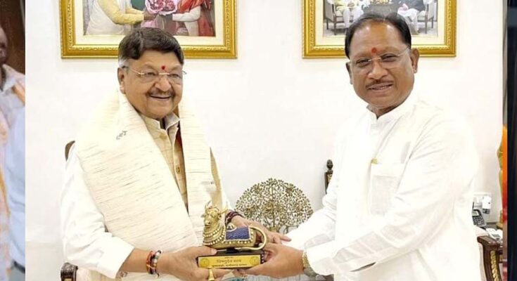 मुख्यमंत्री विष्णु देव साय से आज उनके निवास कार्यालय में मध्यप्रदेश शासन के शहरी विकास मंत्री श्री कैलाश विजयवर्गीय ने सौजन्य मुलाकात की। इस दौरान दोनों नेताओं के बीच राज्य एवं क्षेत्रीय विकास से जुड़े विविध विषयों पर चर्चा हुई। मुख्यमंत्री साय ने श्री विजयवर्गीय का आत्मीय स्वागत किया तथा उन्हें छत्तीसगढ़ की पारंपरिक संस्कृति का प्रतीक शॉल एवं नंदी भेंटकर सम्मानित किया।