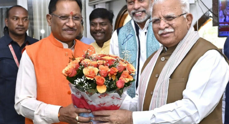 मुख्यमंत्री विष्णु देव साय से आज मुख्यमंत्री निवास में केन्द्रीय आवास और शहरी विकास मंत्री मनोहर लाल खट्टर ने सौजन्य मुलाकात की। मुख्यमंत्री ने खट्टर का शॉल एवं प्रतीक चिन्ह नंदी भेंटकर अभिनंदन किया। इस अवसर पर विधानसभा अध्यक्ष डॉ. रमन सिंह, वन मंत्री केदार कश्यप, विधायक किरण सिंह देव उपस्थित थे।