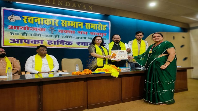 प्रदेश की अग्रणी सामाजिक संस्था वक्ता मंच द्वारा आज 20 अप्रैल को राजधानी के वृन्दावन सभागृह में प्रदेश के 100 रचनाकारों का सम्मान किया गया l वक्ता मंच द्वारा विगत 31 वर्षों से प्रतिवर्ष आयोजित की जानेवाली इस सम्मान श्रृंखला के तहत अब तक प्रदेश के 5000 से अधिक रचनाकारों को प्रोत्साहित किया जा चुका है l आज के आयोजन में यतीश श्रीवास्तव, एम राजीव, खेमेश्वर पुरी गोस्वामी, शिव शंकर सोनपिपरे, शुभा शुक्ला ‘ निशा’ एवं पी के त्रिपाठी अतिथि की आसंदी पर सुशोभित थे l कार्यक्रम का प्रभावी संचालन वक्ता मंच के अध्यक्ष राजेश पराते एवं बेहतरीन संयोजन मंच के संयोजक शुभम साहू द्वारा किया गया l इस अवसर पर डॉ लुनेश कुमार वर्मा के 2 काव्य संग्रह ‘ मन का दर्पण’ एवं ‘ नव प्रभात ‘ का विमोचन एवं सुधा देवांगन शुचि के काव्य संग्रह ‘ मेरा भारत महान ‘ का लोकार्पण भी संपन्न हुआ l अतिथियों ने अपने उद्बोधन में कहा कि साहित्यकारों को राष्ट्र को सार्थक दिशा देनेवाला लेखन करना चाहिए l