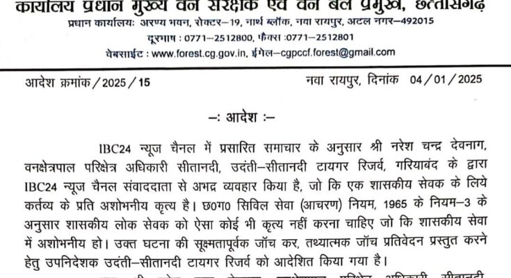 यह आदेश छत्तीसगढ़ के प्रधान मुख्य वन संरक्षक एवं वन बल प्रमुख द्वारा जारी किया गया है। आदेश में कहा गया है कि वन अधिकारी का व्यवहार शासकीय सेवकों के लिए आचरण के मानकों का उल्लंघन है।