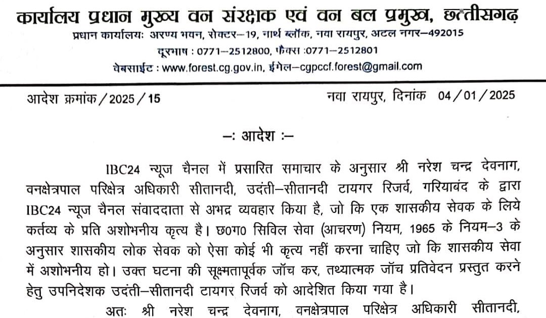 यह आदेश छत्तीसगढ़ के प्रधान मुख्य वन संरक्षक एवं वन बल प्रमुख द्वारा जारी किया गया है। आदेश में कहा गया है कि वन अधिकारी का व्यवहार शासकीय सेवकों के लिए आचरण के मानकों का उल्लंघन है।