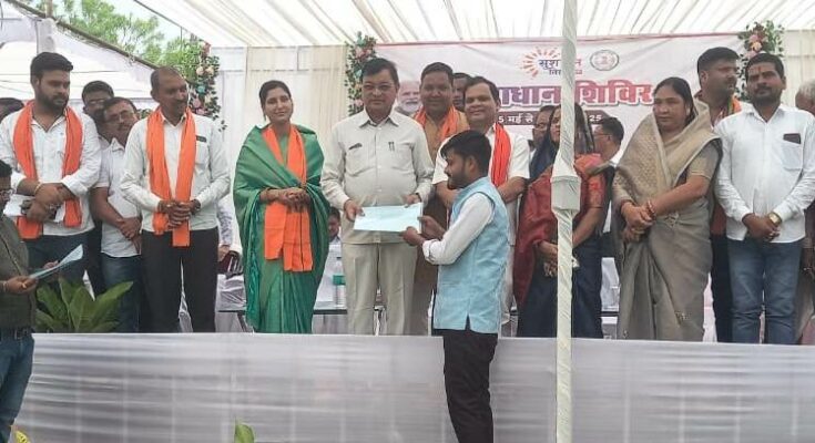 इस अवसर पर जिला पंचायत सभापति अरुणा बनाफर, जिला पंचायत सदस्य शताक्षी सिंह, पूर्व जिला पंचायत धम्मन साहू, जनपद पंचायत अध्यक्ष खैरागढ़ राजेश्री शैलेन्द्र त्रिपाठी, उपाध्यक्ष जनपद पंचायत खैरागढ़ लखन साहू, जनप्रतिनिधियों, पंचायत सदस्यों, और बड़ी संख्या में ग्रामीण उपस्थित थे।शिविर में आज कुल 528 आवेदन प्राप्त हुए जिसमें 06 मांग सहित 522 शिकायत के रहे। शिविर के दौरान जनप्रतिनिधियों ने विभिन्न योजनाओं के तहत पात्र हितग्राहियों को लाभान्वित किया। शिविर में पंचायत विभाग द्वारा 05 हितग्राहियों को आवास पूर्णता सहित 5 हितग्राहियों को व्यक्तिगत शौचालय स्वीकृति प्रमाण पत्र का वितरण किया गया। इसी प्रकार कृषि विभाग द्वारा 5 कृषकों को अरहर बीज, 2 हितग्राहियों को पीएम सम्मान निधि और 1 हितग्राही को स्प्रेयर पम्प वितरण किया गया। इसी प्रकार 06 हितग्राहियों को श्रम कार्ड वितरण, 03 को केसीसी कार्ड, मत्स्य विभाग द्वारा 02 हितग्राहियों को महाजाल, स्वास्थ्य विभाग द्वारा 3 हितग्राहियों को वय वंदन कार्ड प्रदान कर लाभान्वित किया गया। इसके साथ शिक्षा विभाग द्वारा 03 स्कूलों को गणित विज्ञान किट, 02 संपर्क किट, 03 ऑडियो वीडियो किट प्रदान किया गया। इसी प्रकार खाद्य विभाग द्वारा 5 हितग्राहियों को राशन कार्ड, महिला एवं बाल विकास विभाग द्वारा 03 गर्भवती माताओं को सुपोषण किट और 3 बच्चो का अन्नप्रसन्न कराया गया। परिवहन विभाग द्वारा 1 हितग्राही का लर्निंग लाइसेंस वितरण किया गया।