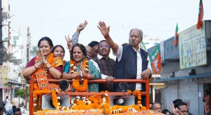बृजमोहन अग्रवाल ने भव्य रोड शो कर भाजपा महापौर उम्मीदवार मीनल चौबे समेत सभी पार्षद प्रत्याशियों के पक्ष में जनता से समर्थन मांगा। भगवती चरण शुक्ल वार्ड और शहीद पंकज विक्रम वार्ड में आयोजित इस रोड शो में मंत्री राम विचार नेताम, विधायक सुनील सोनी समेत हजारों भाजपा कार्यकर्ता एवं स्थानीय नागरिक बड़ी संख्या में उपस्थित रहे। जनता का अपार उत्साह और समर्थन यह दर्शाता है कि रायपुर नगर निगम चुनाव में भाजपा की ऐतिहासिक जीत सुनिश्चित है।